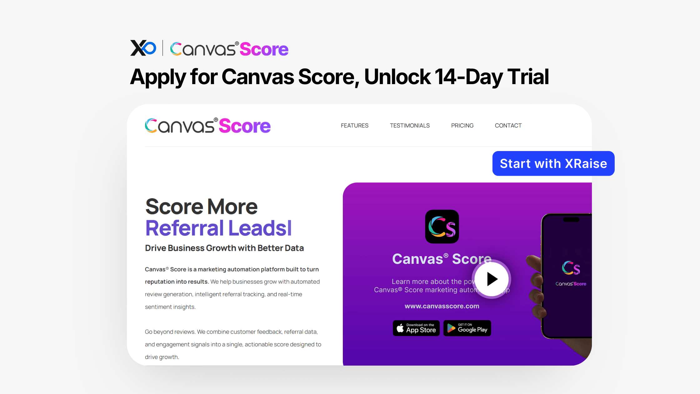 Start from XRaise so your perk stack stays organized, then use Canvas Score’s official site only to confirm terms and plan details.