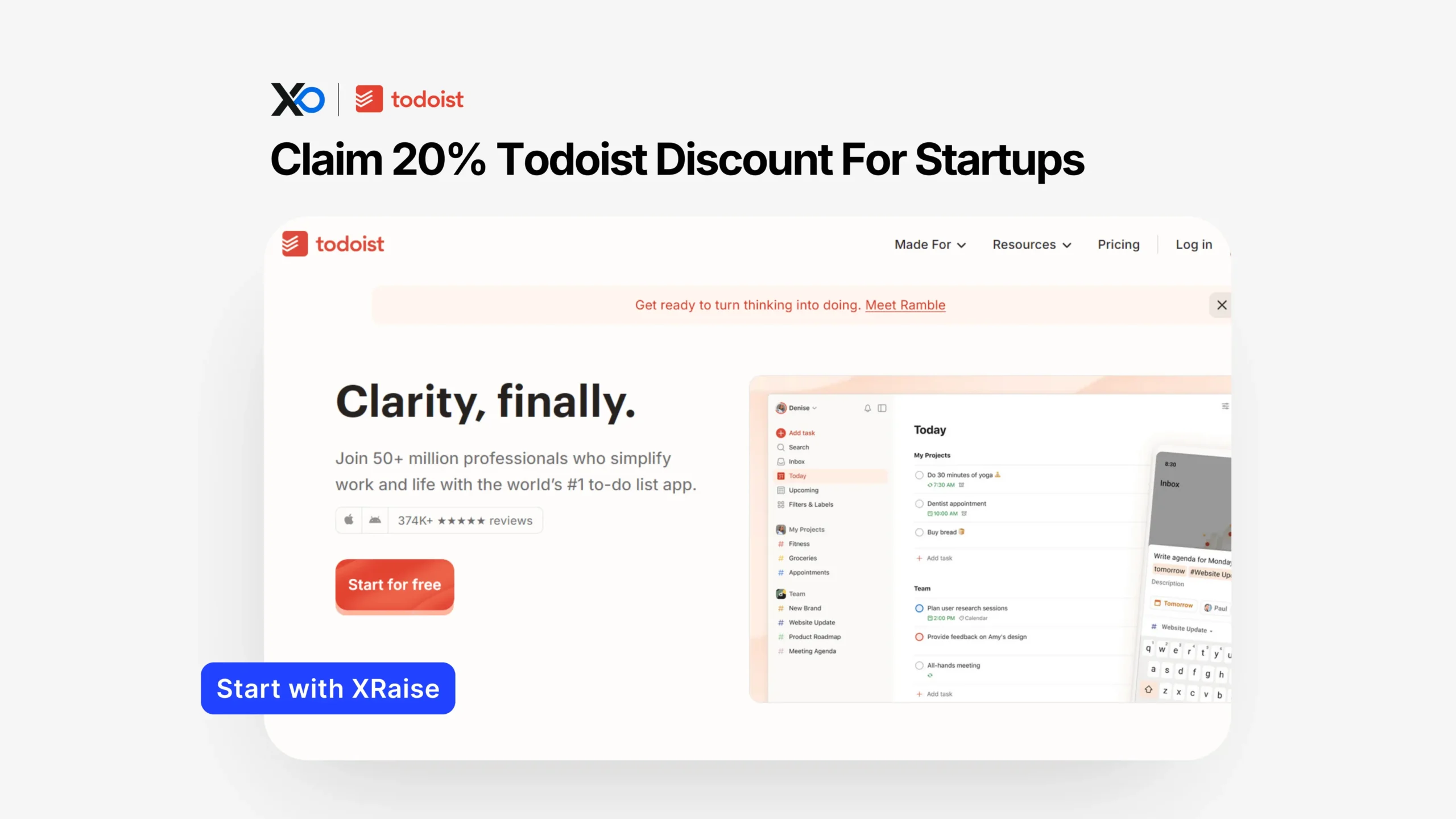 Apply for Todoist to bring structure to your startup’s daily execution while reducing tool friction with a 20% annual discount. This Todoist for Startups perk is available on XRaise, where founders should apply first and use vendor pages only to confirm official terms.