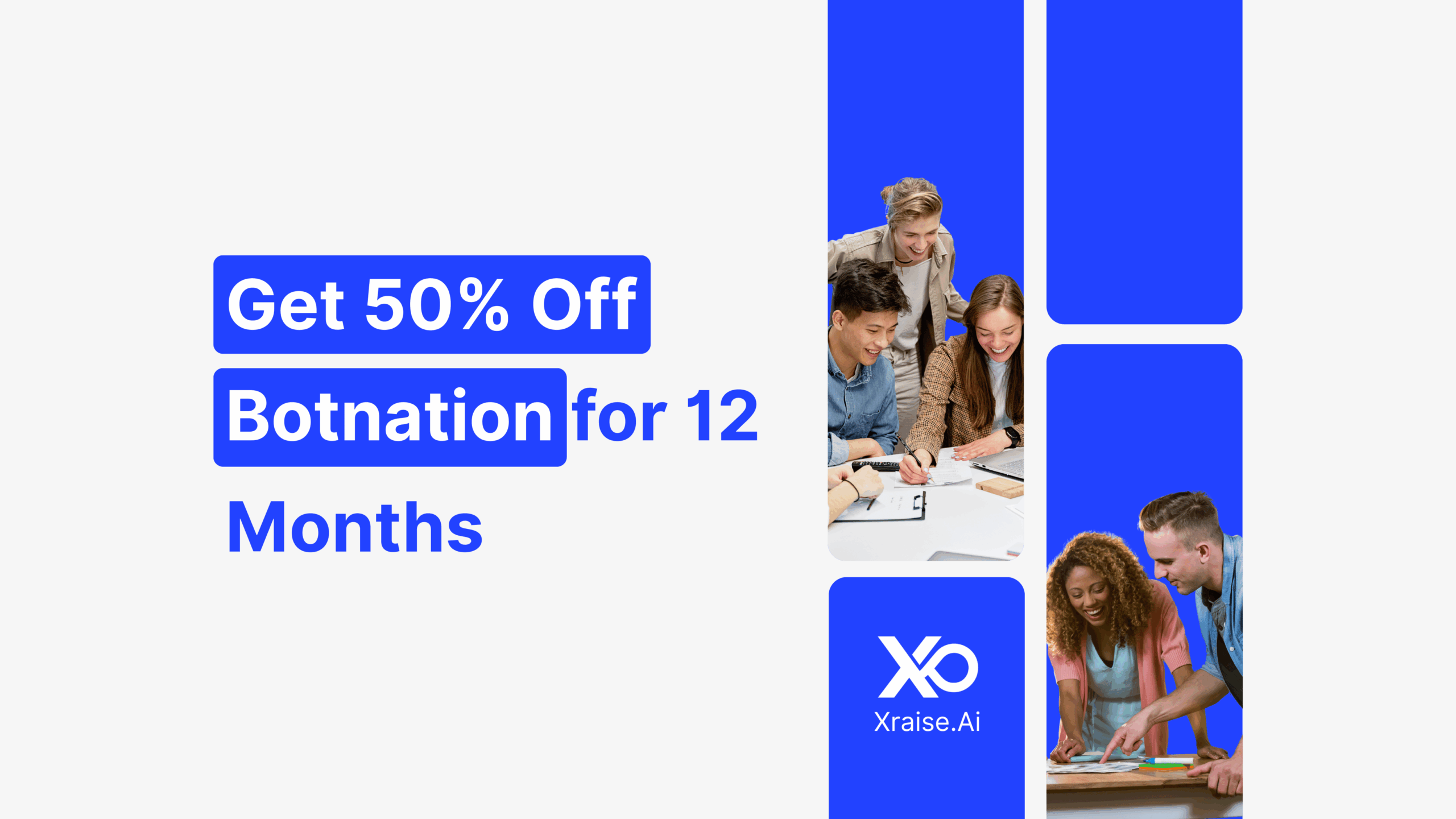 3D features image showing Botnation pricing cards, with a large “50 percent off for 12 months” ribbon next to the XRaise logo.