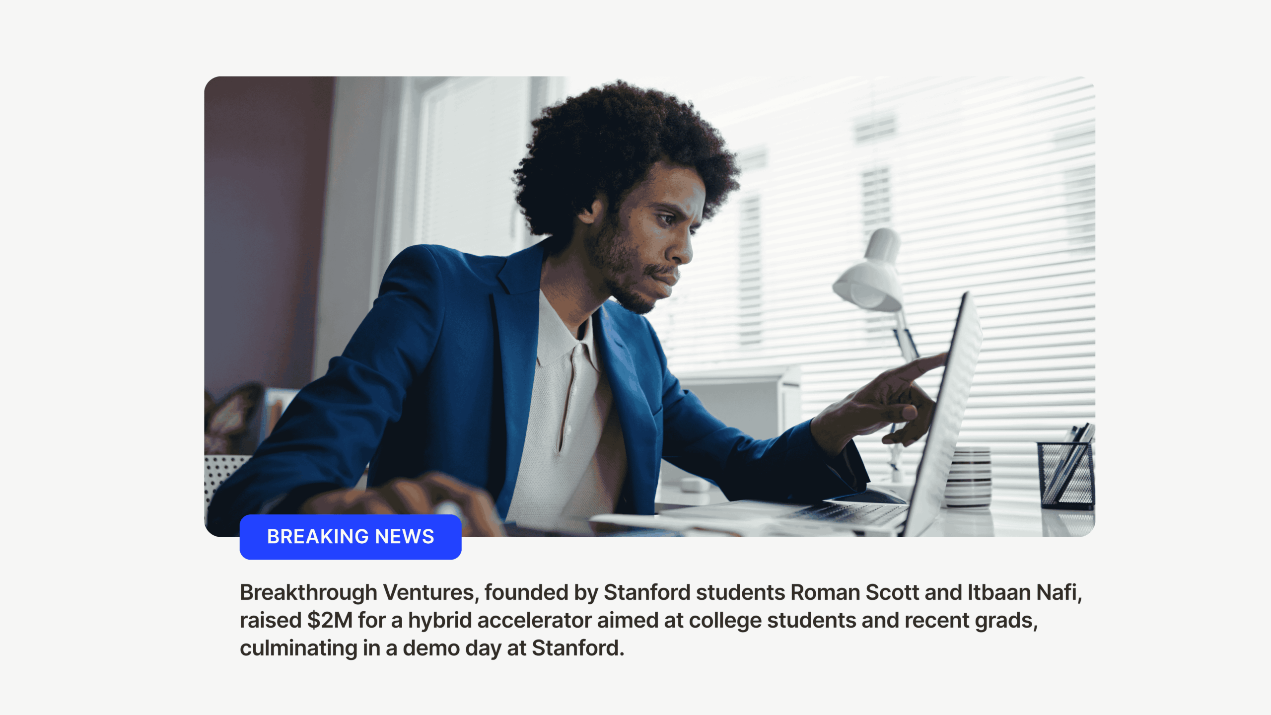 Breakthrough Ventures, founded by Stanford students Roman Scott and Itbaan Nafi, raised $2M for a hybrid accelerator aimed at college students and recent grads, culminating in a demo day at Stanford.